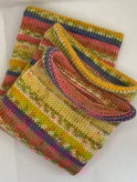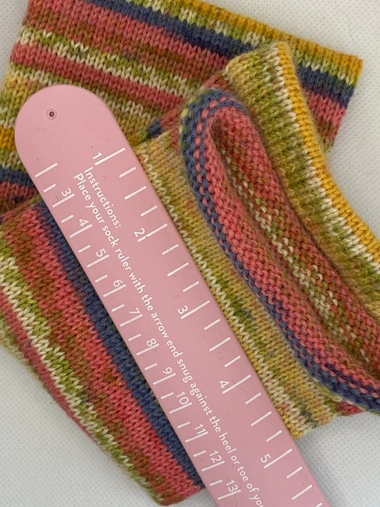 I’ve turned the cuff and left the best for last. To complete socks, insert an afterthought heel at desired length from cuff using yarn from tube. Finish the toe last by picking up stitches where little toe starts and frogging back. Reknit the toe using your preferred method and you’re done. Fits up to men’s 13” long X 11” wide. Very versatile.